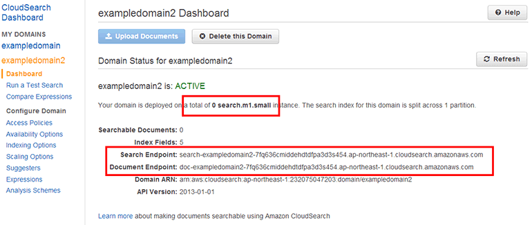 CloudSearch 검색 도메인 생성이 완료되었습니다. 검색 도메인(exampledoamin2)의 세부 내용에 검색 엔드포인트 주소, 문서 엔드포인트 주소가 표시됩니다.