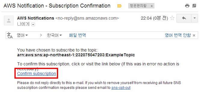 웹 브라우저를 실행하고 SNS 구독을 생성한 이메일 주소의 메일함으로 이동합니다. 메일함을 보면 AWS Notification - Subscription Confirmation이라는 메일이 도착했을 것입니다. 메일 내용에서 Confirm subscription 링크를 클릭합니다.