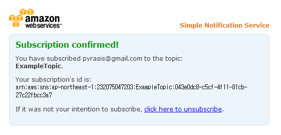 이메일 확인이 완료되었다는 페이지가 표시됩니다. 이제 SNS가 알림을 받을 수 있게 되었습니다.