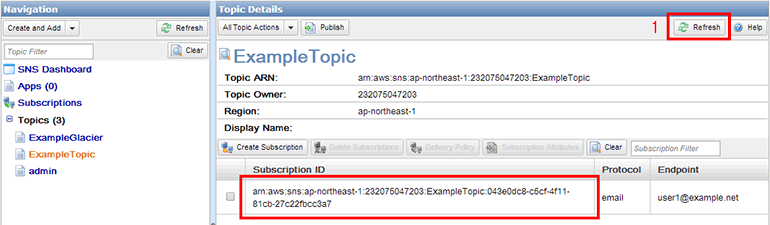 SNS 구독 목록에서 위쪽 Refresh 버튼을 클릭하면 목록이 갱신됩니다. 방금 이메일 인증을 했으므로 구독 ID가 표시됩니다.