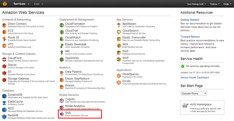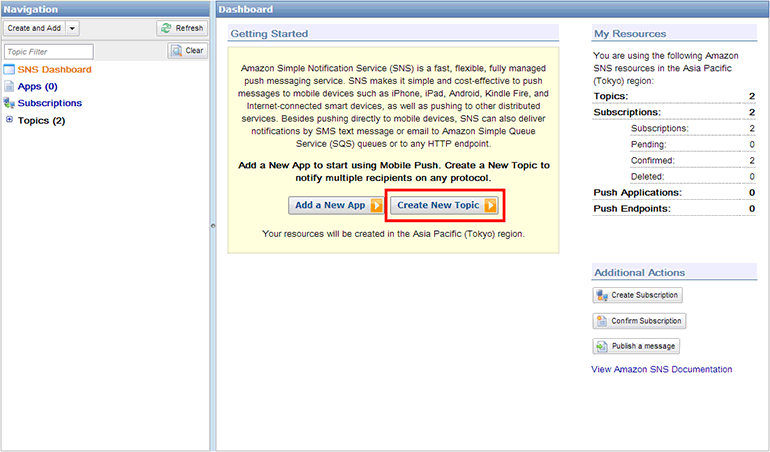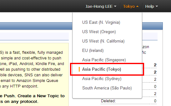 오른쪽 위에서 SNS의 리전을 변경할 수 있습니다. Tokyo 리전을 사용하겠습니다.
