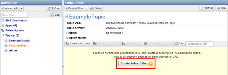사용자 편의상 다른 AWS 리소스에서도 SNS 토픽을 생성할 수 있습니다. '10.1 CloudWatch 알람 생성하기'와 '21.1 Glacier 볼트 생성하기'를 해보았다면 SNS 토픽이 생성되어 있을 것입니다.