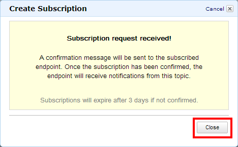 SNS 구독의 엔드포인트를 인증합니다. 이메일은 스팸 메일을 방지하기 위해 자신의 이메일이 맞는지 인증 메일을 보냅니다. Close 버튼을 클릭합니다.