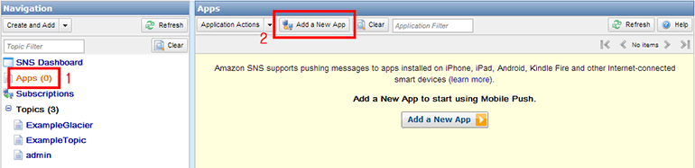 SNS 애플리케이션 목록에 SNS 애플리케이션(ExampleGCM)이 생성되었습니다.