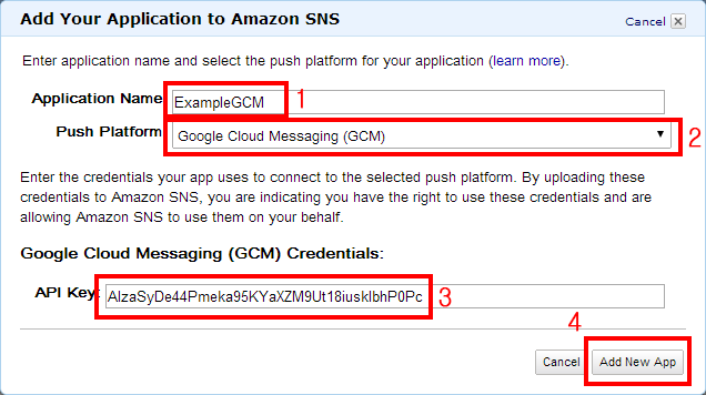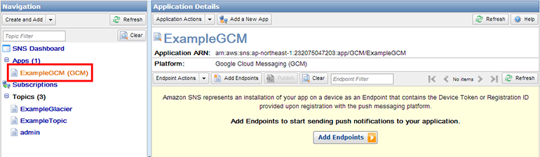 - Application Name: SNS 애플리케이션의 이름입니다. ExampleGCM을 입력합니다.