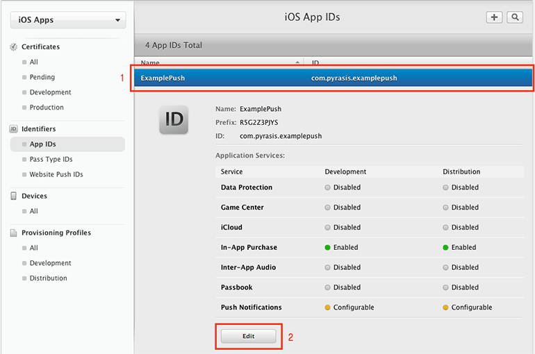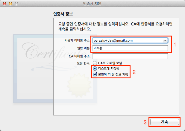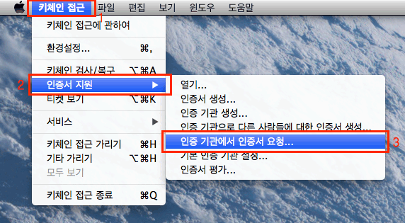 Mac OS X에서 인증서 요청Certificate Signing Request을 생성합니다. 응용 프로그램 → 유틸리티 → 키체인 접근을 실행합니다. 그리고 메뉴에서 키체인 접근 → 인증서 지원 → 인증 기관에서 인증서 요청...을 클릭합니다.