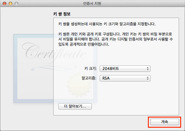 인증서 요청의 키 쌍을 설정합니다. 키 크기가 2048비트, 알고리즘이 RSA인지 확인한 뒤 계속 버튼을 클릭합니다.