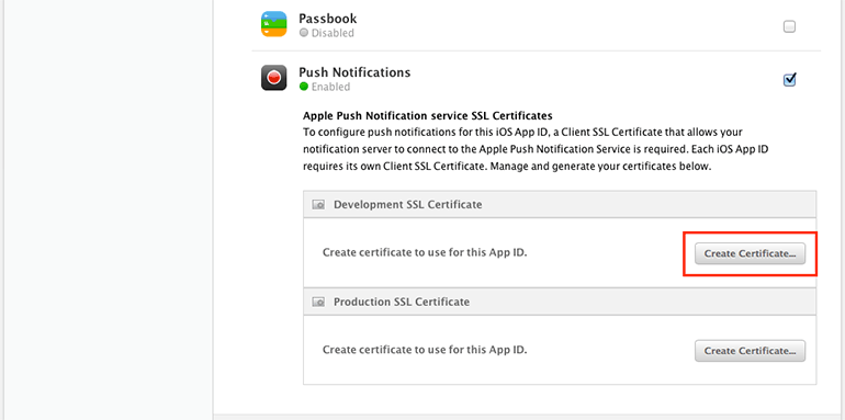 우리는 APNS_SANDBOX를 사용할 것이므로 App ID 설정 화면에서 아래쪽으로 스크롤한 뒤 Push Notifications에서 Development SSL Certificate의 Create Certificate... 버튼을 클릭합니다.