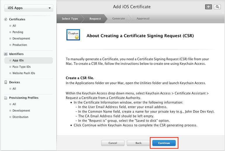 화면에 보이는 설명은 인증서 요청 파일을 생성하는 방법입니다. 앞에서 인증서 요청 파일을 생성했으므로 Continue 버튼을 클릭합니다.