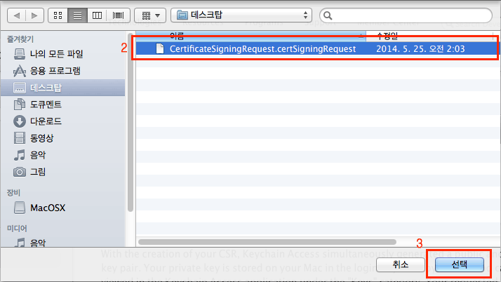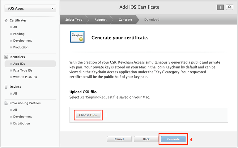 데스크탑에 저장된 인증서 요청 파일(CertificateSigningRequest.certSigningRequest)을 선택하고 선택 버튼을 클릭합니다. 인증서 요청 파일을 열었으면 Generate 버튼을 클릭합니다.