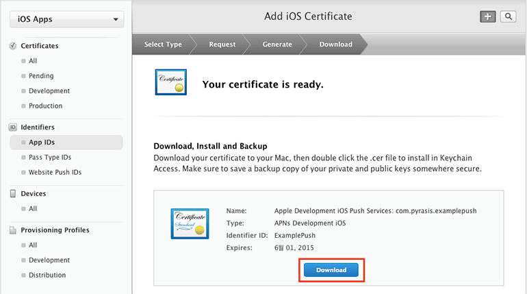 APNS_SANDBOX 인증서 생성이 완료되었습니다. Mac OS X에서 Download 버튼을 클릭하여 APNS 인증서 파일을 다운로드합니다(데스크탑에 저장합니다).