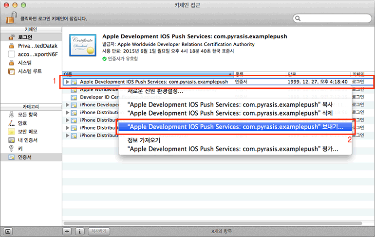 인증서 목록에서 Apple Development IOS Push Services: com.<도메인>.examplepush를 선택한 뒤 마우스 오른쪽 버튼을 클릭하면 팝업 메뉴가 표시됩니다. 여기서 "Apple Development IOS Push Services: com.<도메인>.examplepush" 보내기...를 클릭합니다.