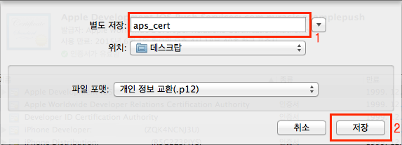APNS 인증서 파일을 p12 인증서 파일로 저장합니다. 별도 저장에 aps_cert를 입력하고 위치는 데스크탑으로 설정한 뒤 저장 버튼을 클릭합니다.