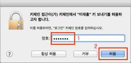 이 작업은 관리자 권한이 필요합니다. 관리자 계정의 암호를 입력하고 허용 버튼을 클릭합니다.