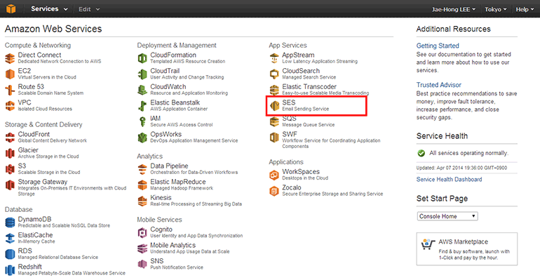 AWS 콘솔로 접속한 뒤 메인 화면에서 App Services의 SES를 클릭합니다.