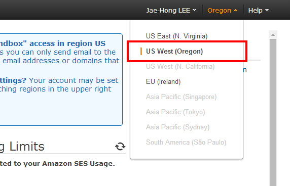 오른쪽 위에서 SNS의 리전을 변경할 수 있습니다. 이 책에서는 Oregon 리전을 사용하겠습니다.