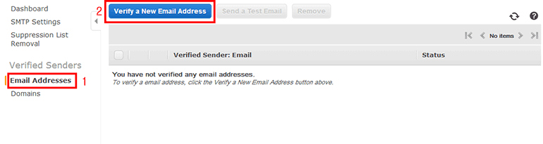 왼쪽 메뉴에서 이메일 주소 목록(Verified Senders → Email Addresses)을 클릭한 뒤 위쪽 Verify a New Email Address 버튼을 클릭합니다.