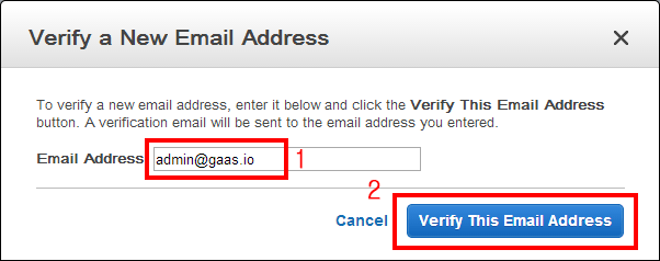 SES 이메일 주소 인증 창이 표시됩니다. Email Address 부분에 인증할 이메일 주소를 입력한 뒤 Verify This Email Address 버튼을 클릭합니다.