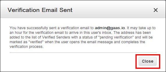 입력한 이메일 주소로 인증 메일이 발송되었다는 알림 창이 표시됩니다. Close 버튼을 클릭합니다.