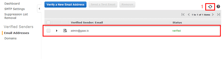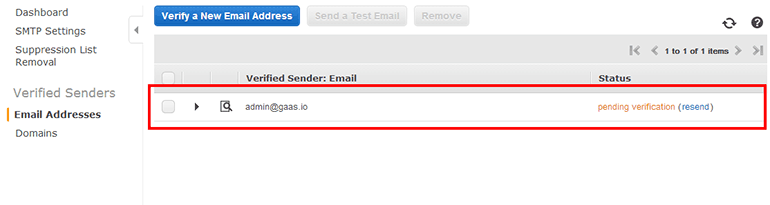 SES 이메일 주소 목록에 이메일 주소가 추가되었습니다. 아직 인증이 되지 않았다고 표시됩니다.