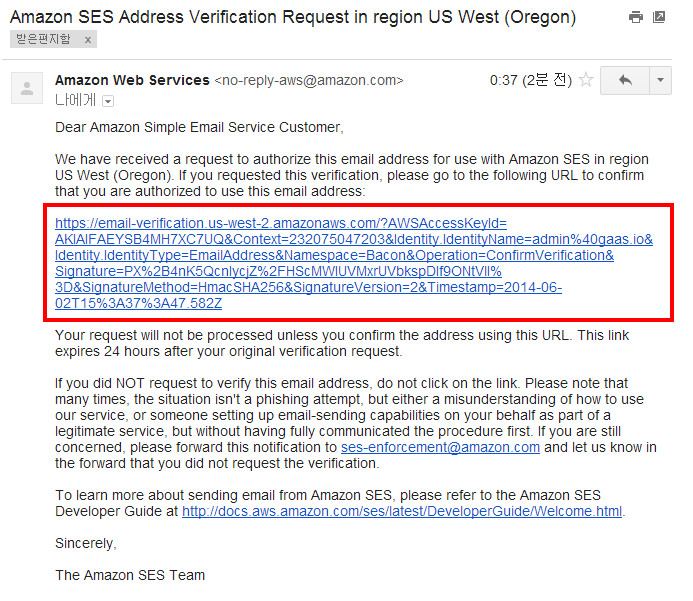 웹 브라우저나 기타 메일 프로그램에서 입력한 이메일의 메일함으로 이동합니다. 메일함을 보면 Amazon SES Address Verification Request in region US West(Oregon)이라는 메일이 도착했을 것입니다. 메일 내용에서 https://email-verification.us-west-2.amazonaws.com으로 시작하는 링크를 클릭합니다.