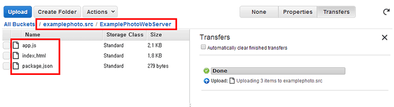 앞에서 생성한 <프로젝트 이름>.src S3 버킷에 ExamplePhotoWebServer라는 디렉터리를 생성하고 app.js, package.json, index.html 파일을 올립니다.