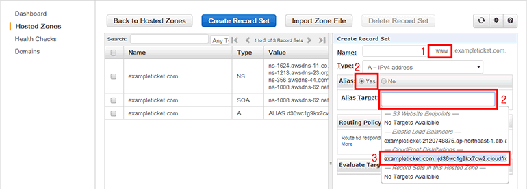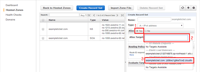 웹 서버용 CloudFront 배포에 최상위 도메인(예: exampleticket.com)을 연결합니다. A - IPv4 address를 선택하고 Alias Target 부분을 클릭하면 연결할 수 있는 AWS 리소스가 표시됩니다. 여기서 방금 생성한 CloudFront 배포를 선택합니다.