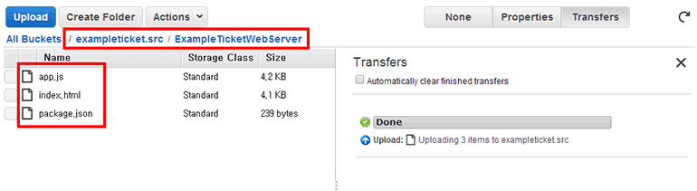 앞에서 생성한 <프로젝트 이름>.src S3 버킷에 ExampleTicketWebServer라는 디렉터리를 생성하고 app.js, package.json, index.html 파일을 올립니다.