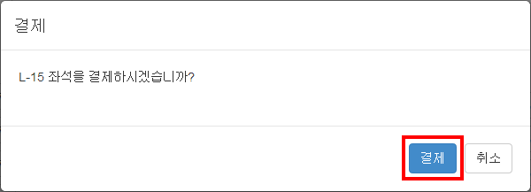 다시 첫 번째 웹 브라우저의 결제 창에서 결제 버튼을 클릭합니다. 만약 취소 버튼을 클릭하면 결제 창이 닫히고 예약한 좌석은 다시 흰색으로 바뀌고, 취소 상태가 됩니다.