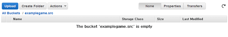 게임 서버 Node.js 소스는 S3 버킷에 저장하겠습니다. 게임 서버 Node.js 소스 저장용 S3 버킷을 <프로젝트 이름>.src 형식으로 생성합니다. 저는 examplegame.src로 생성했습니다 examplegame.src는 이 책을 쓰는 시점에 제가 이미 사용하고 있으므로 같은 이름을 사용할 수 없습니다. 그림 33-2와는 다른 이름으로 생성합니다).