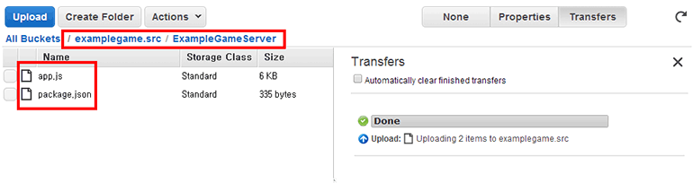 앞에서 생성한 <프로젝트 이름>.src S3 버킷에 ExampleGameServer라는 디렉터리를 생성하고 app.js, package.json 파일을 올립니다.
