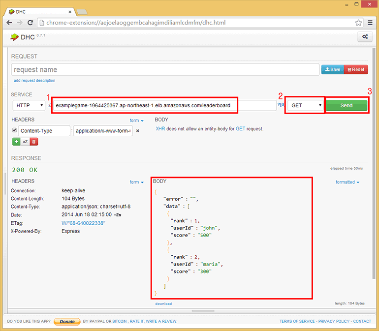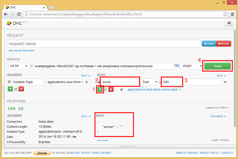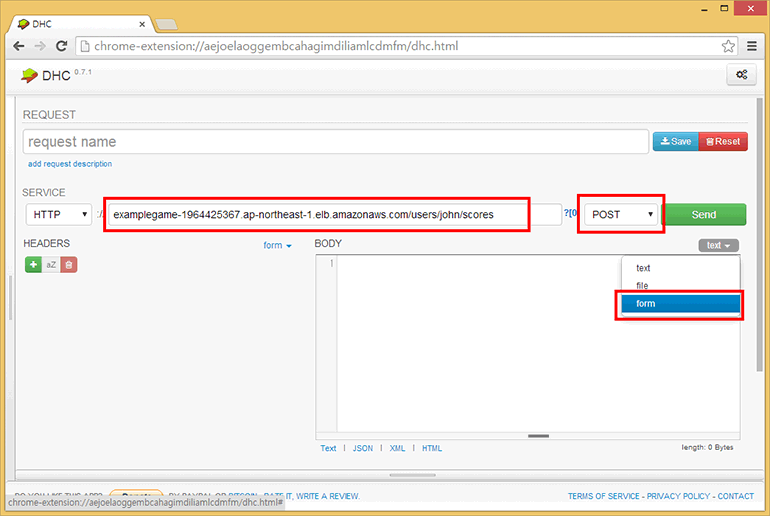 - SERVICE에 게임 서버의 ELB 로드 밸런서 주소와 API 경로를 입력합니다. 먼저 john의 점수를 보낼 것이므로 API 경로는 /users/john/scores가 됩니다.