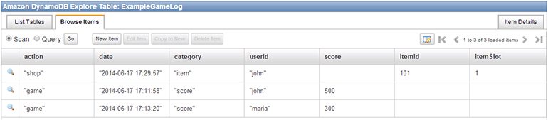 DynamoDB로 가보면 ExampleGameLog 테이블에 로그 데이터가 저장되어 있습니다.