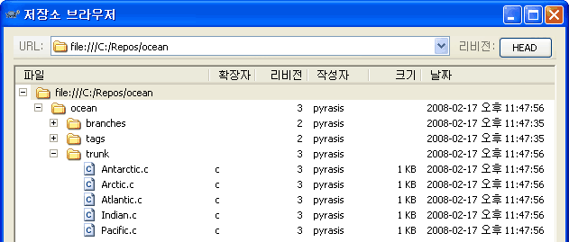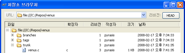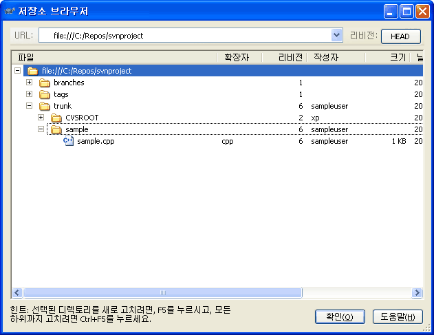 변환된 C:\Repos\svnproject를 TortoiseSVN의 저장소 브라우저로 살펴보면 아래와 같이 trunk 디렉터리 아래에 CVSROOT와 sample 디렉터리가 위치하고 있는 것을 확인할 수 있습니다.