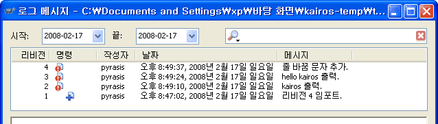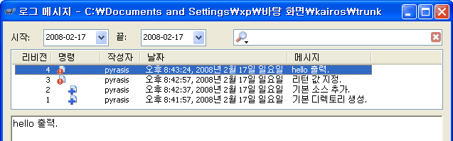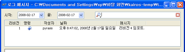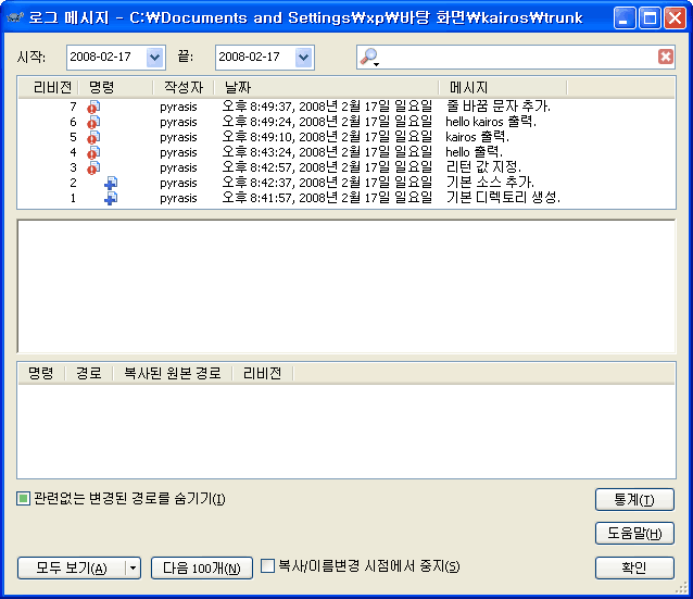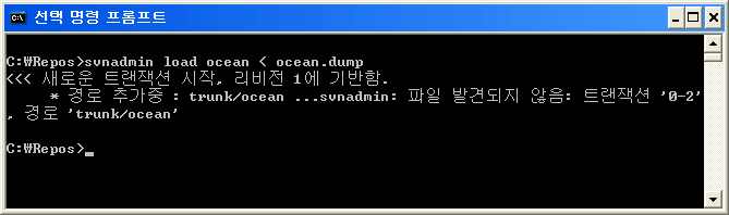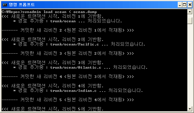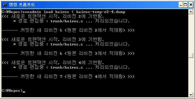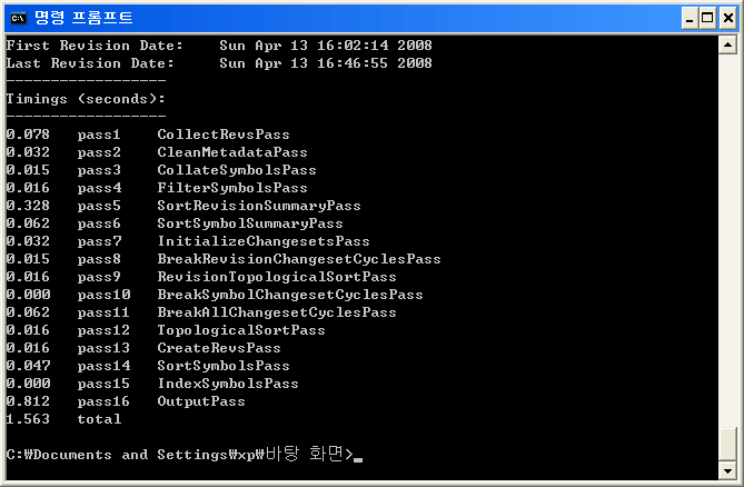 시작 → 모든 프로그램 → 보조 프로그램 → 명령 프롬프트를 실행합니다. 이제 cvs2svn을 사용하여 CVS 저장소를 Subversion 저장소로 변환하겠습니다. cvs2svn 옵션 -s "Subversion 저장소 경로" "CVS 저장소 경로" 형식으로 사용합니다.