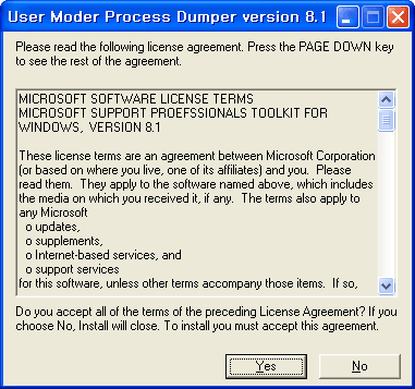 1. UserModeProcessDumper8_1_2929_5.exe를 실행합니다. Yes를 누릅니다.