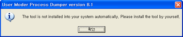 3. 자동 실행되지 않도록 설정 되었으니 직접 설치하라는 말이 나옵니다. 확인을 눌러 넘어갑니다. User Mode Process Dumper를 사용하려면 자체적인 설치과정을 거쳐야 합니다.