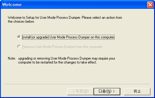 5. User Mode Process Dumper를 설치합니다. 다음을 눌러 넘어갑니다. 처음 설치하는 것이라면 Install 부분만 활성화 되어 있을 것입니다. 설치 후 삭제하려면 다시 setup.exe를 실행하여 Remove User Mode Process Dumper from this computer를 선택하면 됩니다.