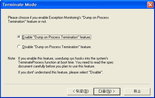 6. 프로세스가 종료 되었을 때 덤프를 생성하는 기능의 사용 여부를 설정하는 화면입니다. Enable을 선택하여 이 기능을 사용합니다. 마침을 누르면 설치를 시작합니다.