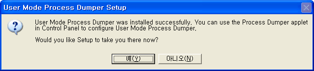 7. 설치가 성공적으로 끝났습니다. 제어판에 Process Dumper 항목이 추가됩니다. "예"를 누르면 제어판의 Process Dumper 항목을 실행합니다.