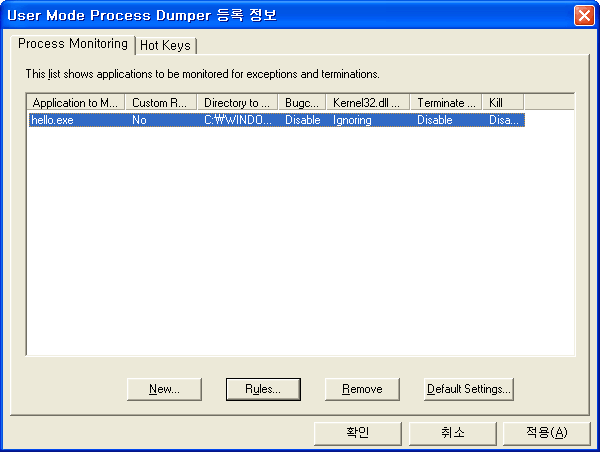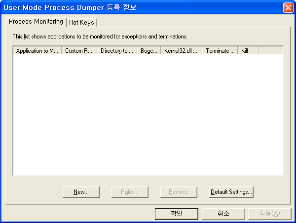 이번에는 단축키를 지정하고 사용하는 방법을 알아보겠습니다. 제어판의 Process Dumper를 실행하고 Hot Keys 탭으로 이동합니다. New... 버튼을 누르면 새로운 단축키 설정을 추가 할 수 있습니다.