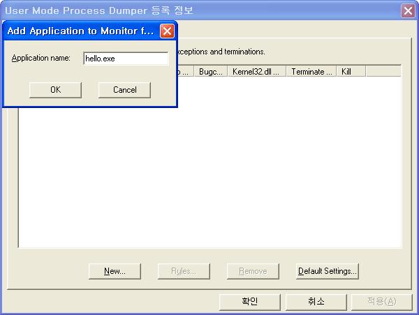 9. User Mode Process Dumper는 프로세스 하나를 지정하여 세부 설정을 하도록 되어 있습니다. 즉 프로세스 마다 설정값을 다르게 할 수 있습니다. New... 버튼을 누르면 실행 파일의 이름을 입력하는 창이 나옵니다. 여기에 덤프를 생성할 실행 파일의 이름을 입력합니다.