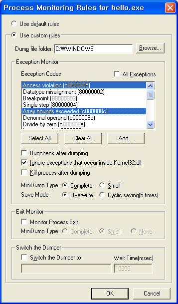 Exception Codes특정 예외에서만 덤프가 발생하도록 하거나, 특정 예외를 무시하도록 설정할 수 있습니다. All Exceptions 체크 박스를 체크하면 모든 예외가 선택됩니다. Add... 버튼으로 예외 코드를 추가할 수 있습니다.