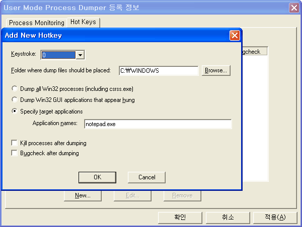 |:-|:-| |Keystroke|0 부터 Z까지 지정할 수 있습니다. 이 설정이 해당 프로세스의 덤프 파일을 생성하는 단축키가 됩니다.| |Folder where dump files should be placed|덤프 파일이 생성될 경로입니다.| |Dump all Win32 processes (including csrss.exe)|모든 프로세스의 덤프 파일을 생성합니다.| |Dump Win32 GUI applications that appears hung|GUI 프로그램 중 응답이 없는 프로그램만 덤프 파일을 생성합니다.| |Specify target applications|특정 프로그램만 덤프 파일을 생성합니다.| |Kill process after dumping|덤프 파일을 생성 한 뒤 해당 프로세스를 종료합니다.| |Bugcheck after dumping|덤프를 생성하고 Bugcheck가 실행됩니다. 이 Bugcheck는 우리가 흔히 보는 블루스크린을 뜻합니다. Bugcheck가 실행되면 블루스크린이 나오고 커널 모드 덤프를 생성한 뒤 컴퓨터는 재부팅 됩니다.|