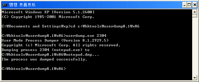 이렇게 실행하면 cd c:\kktools\userdump8.1\x86 디렉터리에 프로세스 ID가 2304인 프로세스의 덤프 파일이 생성됩니다.