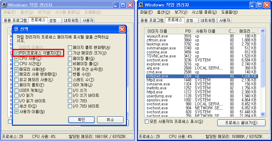 PID(프로세스 식별자)(P)를 체크하면 오른쪽 화면과 같이 각 프로세스에 해당하는 프로세스 ID(PID)가 표시됩니다.