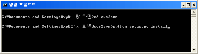 시작 → 모든 프로그램 → 보조 프로그램 → 명령 프롬프트를 실행하고 체크아웃한 cvs2svn 디렉터리로 이동한 후 아래와 같이 python.exe로 setup.py를 실행시킵니다(부록 CD에 포함 된 cvs2svn-r4503.zip 파일도 설치 방법은 똑같습니다).