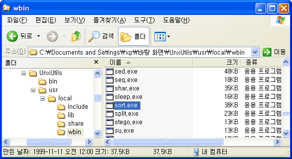 UnxUtils.zip 파일의 압축을 해제하면 bin, usr 두개의 디렉터리가 나옵니다. 여기서 usr → local → wbin 디렉터리로 이동하여 sort.exe 파일을 C:\tools 로 복사합니다.