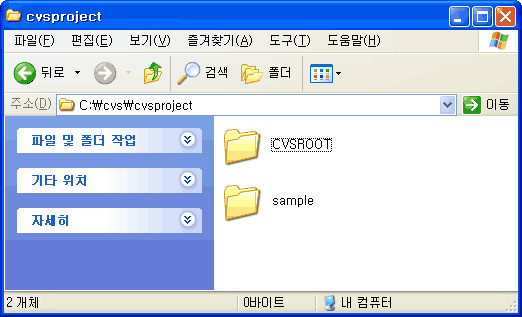 아래와 같이 기존에 사용하던 CVS 저장소가 있습니다. 이 CVS 저장소는 CVSROOT 모듈과 sample 모듈을 포함하고 있습니다. Subversion으로 변환하게 되면 trunk 디렉터리 아래에 CVSROOT, sample 디렉터리가 위치하게 됩니다.