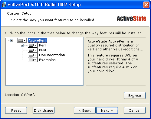 ActivePerl이 설치 될 경로를 지정하고, 설치 요소를 선택하는 화면입니다. 기본 설정대로 설치합니다.